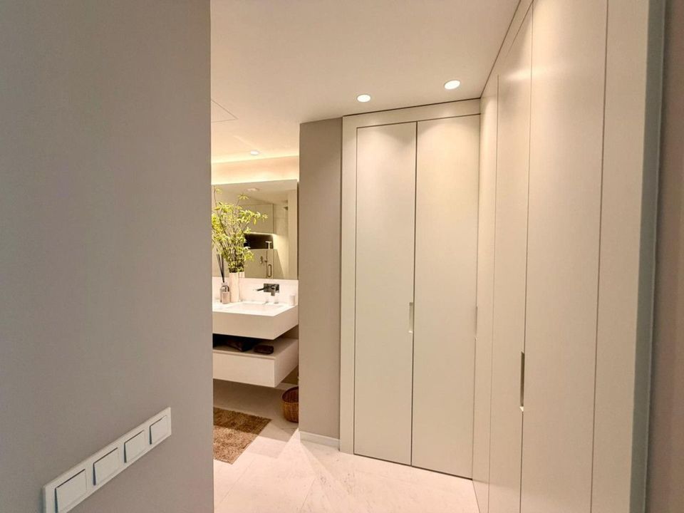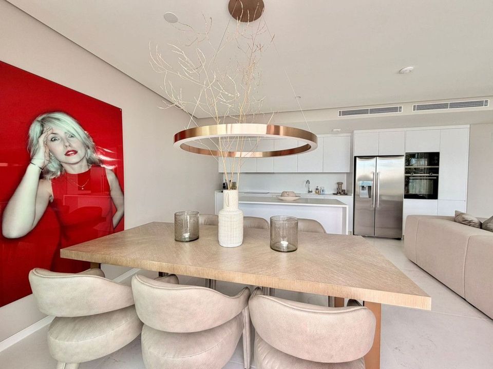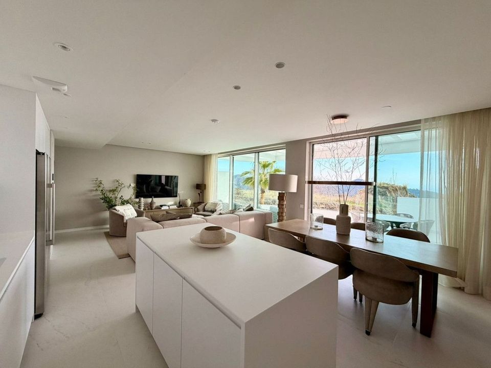 The apartment features a contemporary open-plan living and dining area with a modern kitchen, designed to maximise space and natural light. Its south-facing orientation ensures the interiors are flooded with sunshine throughout the day, while the spacious private terrace offers stunning sea views.