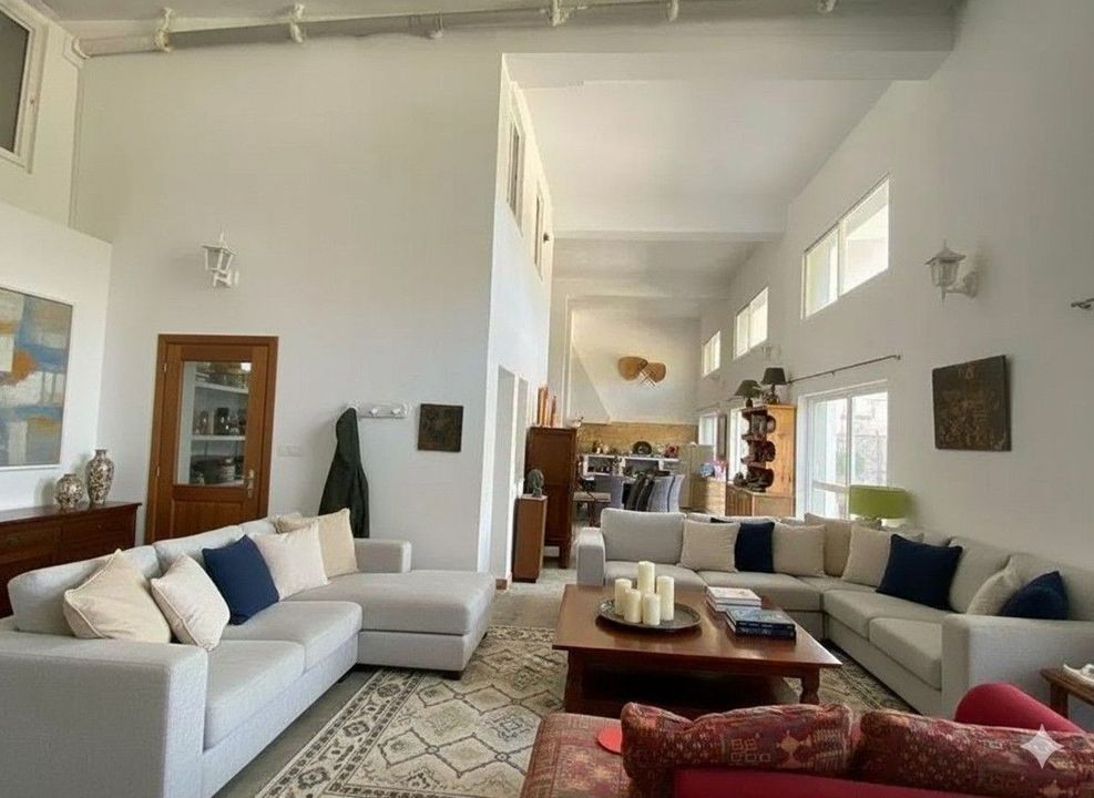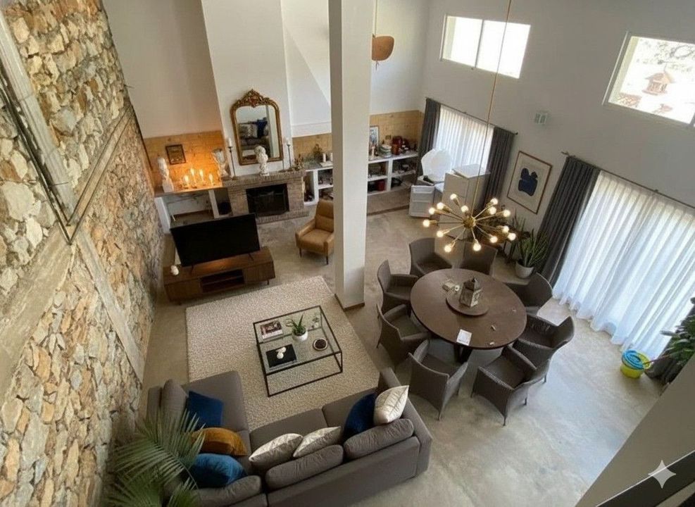 On the lower floor, an impressive loft-style space with a fireplace creates the perfect setting for cozy afternoons, alongside a huge relaxation area that can also serve as a children's playground.