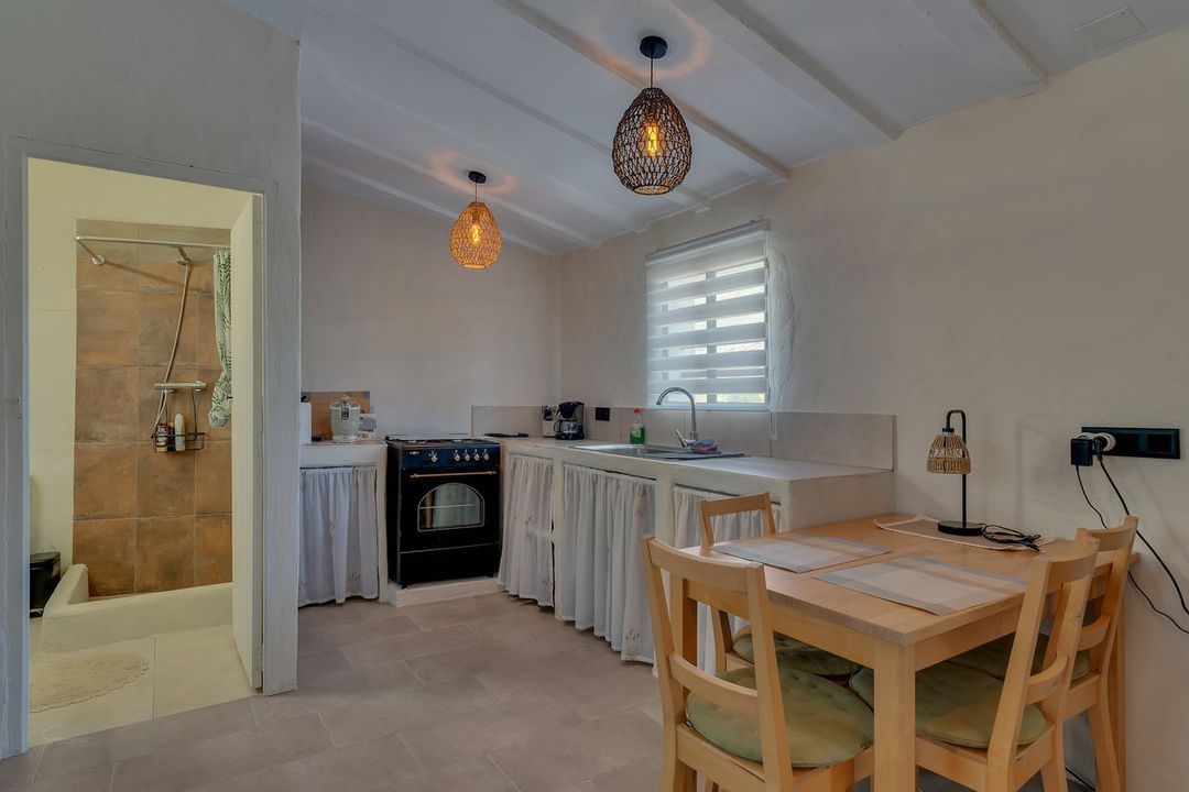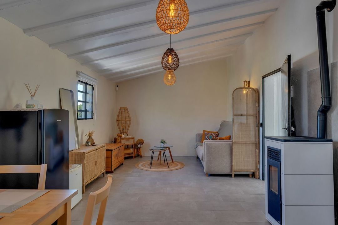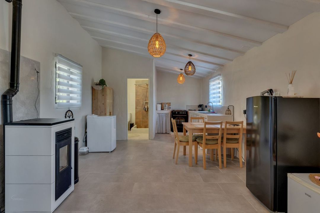 Guest house- Separate entrance, open plan kitchenette, lounge and dining, bedroom, bathroom, pellet burner, covered terrace.