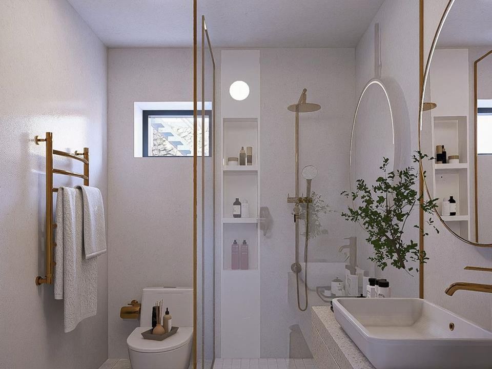 Sanitair inclusief zwevend toilet, wastafelmeubels, moderne douchebakken, mengkranen in zwart of chroom.