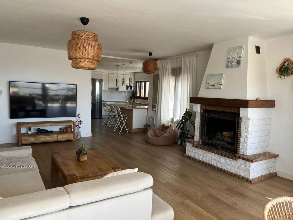 The property features a large living room with a fireplace, ideal for enjoying a warm and inviting atmosphere, and an open-plan fitted kitchen integrated into the living room, equipped with an electric water heater.