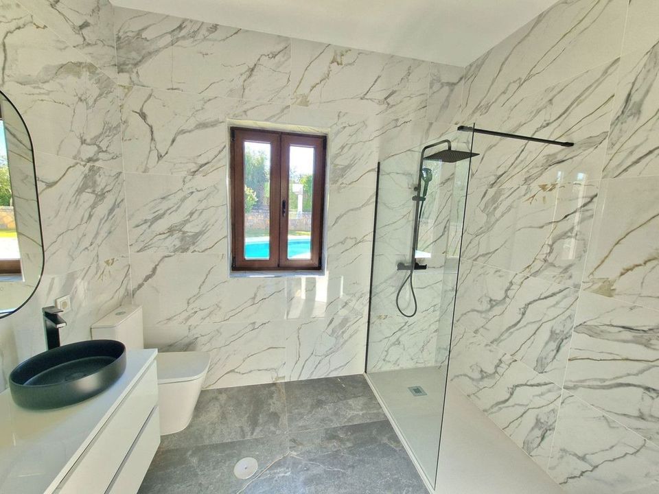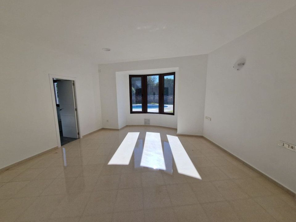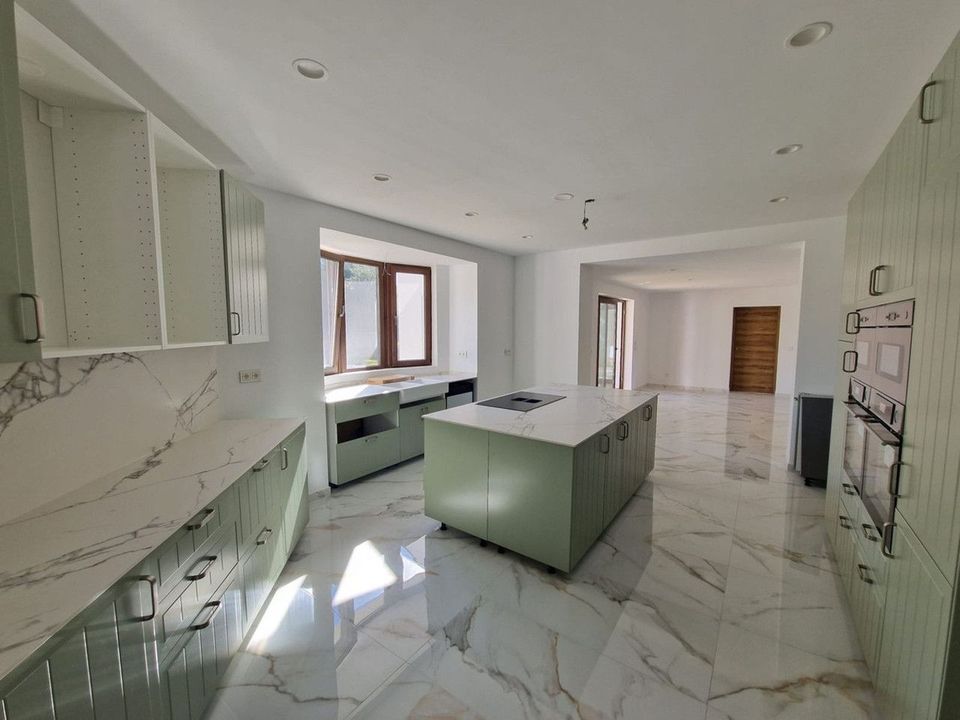 The villa features four large bedrooms, all with en-suite bathrooms, plus a guest toilet. Highlights include a grand living room with a fireplace, a spacious sitting room, and a generously sized kitchen-dining area, ideal for family life and entertaining.