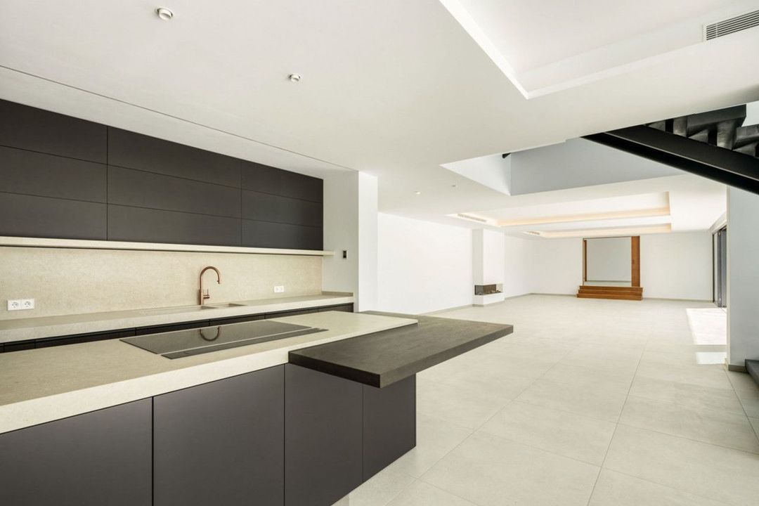 The interiors reflect a contemporary style, with high-quality finishes and a neutral color palette that conveys serenity. The open-plan kitchen is equipped with state-of-the-art Miele appliances, ideal for those who value functionality and design in their daily lives. Additionally, the home automation system, underfloor heating, air conditioning, and a four-person elevator that reaches the rooftop further enhance the modern living experience.