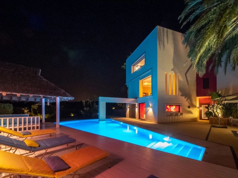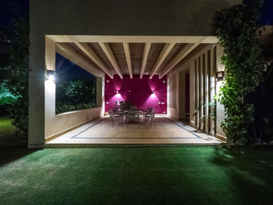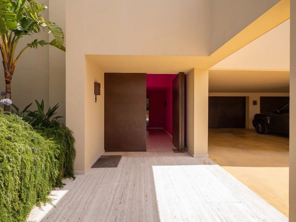 The main rooms, decorated with the nicest Georgetti furniture and kitchen all have access to the outdoor with certain areas having the Barragan-specific strong colours. Bright walls accentuate the space on the terraces near the Koi pond and the sun protected outside BBQ area, which connects to a split-level garden with fountain and strong colour wall surrounding, protected to wind and offering total privacy. The infinity swimming pool with stunning Siccis mosaic, IPE wooden terrace and Mexican style hut. The most dramatic style part of this mansion is the spacious outdoor living area with glass roof and electric sculpted lattice shutters which play with ever changing quality of light and shade from roof and front part separating the garden without taking away the sea view.