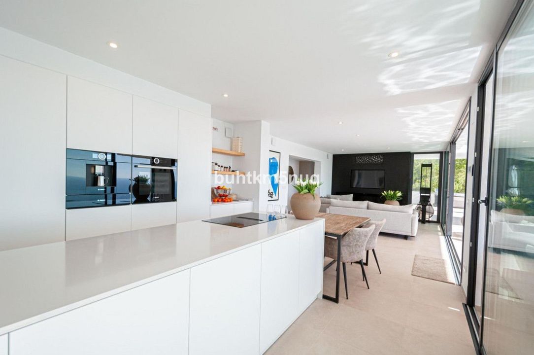Welkom bij Villa Moraira 180° Oceanview,~~De naam van deze luxe villa spreekt voor zich, met adembenemend uitzicht over de hele regio vanuit elke hoek van het pand. Deze luxe villa is onlangs voltooid en uitgerust met alle nieuwste apparatuur en materialen, met minutieuze aandacht voor detail.~~De villa is verspreid over 4 verdiepingen verbonden door een lift, die gaat vanaf het entreeniveau tot aan het woongedeelte, met toegang tot de 2 bovenste slaapkamers via trappen. Op het entreeniveau bevindt zich een open ruimte die volledig is voorbereid om te worden omgebouwd tot een slaapkamer ensuite, of het kan worden gebruikt als een ruime garage voor 2 auto's door een garagedeur toe te voegen; dit is inbegrepen in de prijs en aanpasbaar aan de behoeften van de nieuwe eigenaars.~~Op het tweede niveau vind je een ruime slaapkamer ensuite met een inloopkast. Omdat dit niet direct verbonden is met het hoofdwoongedeelte, biedt het een uiterst unieke ruimte voor gasten, met ongelooflijk uitzicht beschikbaar vanuit alle delen van het pand!~~Bewegend naar het derde niveau, kom je aan bij het woongedeelte. Buiten heb je het zoutwaterzwembad omringd door een BBQ-ruimte, een loungegedeelte en een gezellige hoek om van elke maaltijd van de dag te genieten. Binnen vind je de volledig uitgeruste Amerikaanse keuken met de nieuwste apparatuur en premium merken. Naast de keuken vind je het eetgedeelte, het woongedeelte en de gastenbadkamer, allemaal verbonden met het ruime terras door schuifdeuren, wat een echt mediterraan leefstijl biedt.~~Via trappen ga je naar de bovenste 2 slaapkamers, beide ensuite. Een van de kamers heeft een tweepersoonsbed met een extra ruimte met een uitschuifbaar bed, dat ook kan worden gebruikt als kantoorruimte of extra garderobe. De hoofdslaapkamer zelf komt met een inloopkast/makeup-ruimte en een eigen terras.~~Alle airconditioningunits zijn geïntegreerd in het ontwerp en handig bedekt met panelen. Er is vloerverwarming in de hele woning.~~Als je op zoek bent naar een state-of-the-art villa met adembenemend uitzicht, dan is dit de plek voor jou.~~Dit alles ligt op slechts 9 minuten rijden van Moraira en 20 minuten van Calpe.