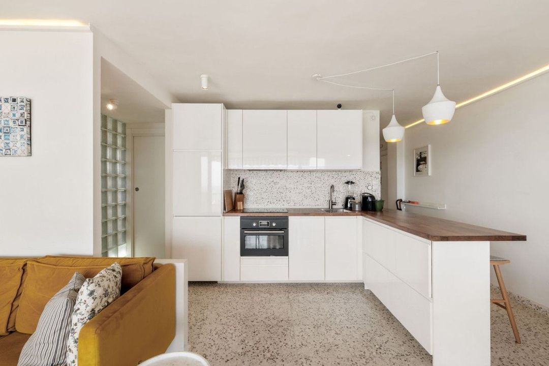 De open keuken sluit perfect aan op de woonkamer en creëert een lichte en sociale leefruimte.