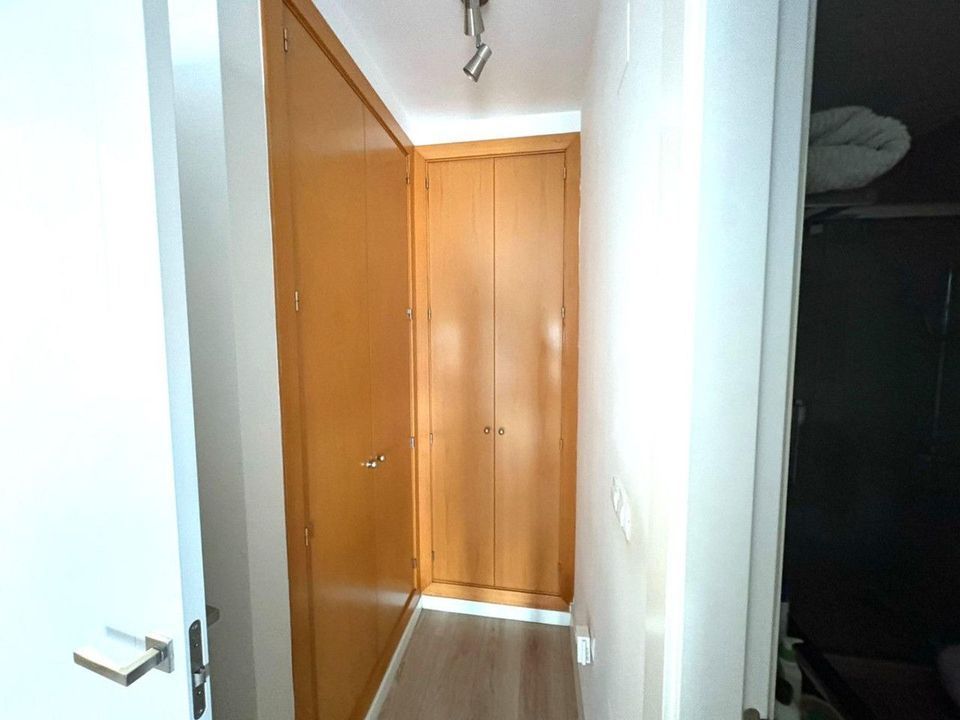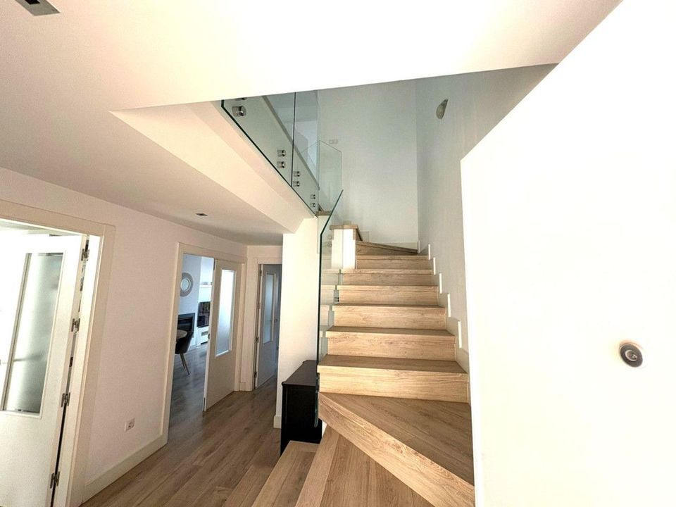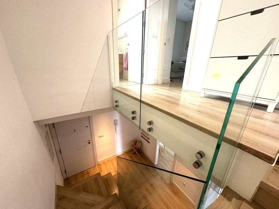 Upon entering, you're welcomed by a spacious and bright foyer featuring a modern staircase with a tempered glass railing, adding a contemporary touch to the home. The main floor offers a functional layout with a fully equipped kitchen, separate laundry room, a full bathroom, one bedroom, and a spacious living-dining area with direct access to a generous terrace. From here, you can enjoy breathtaking open views of the Bay of Málaga — a true daily luxury.