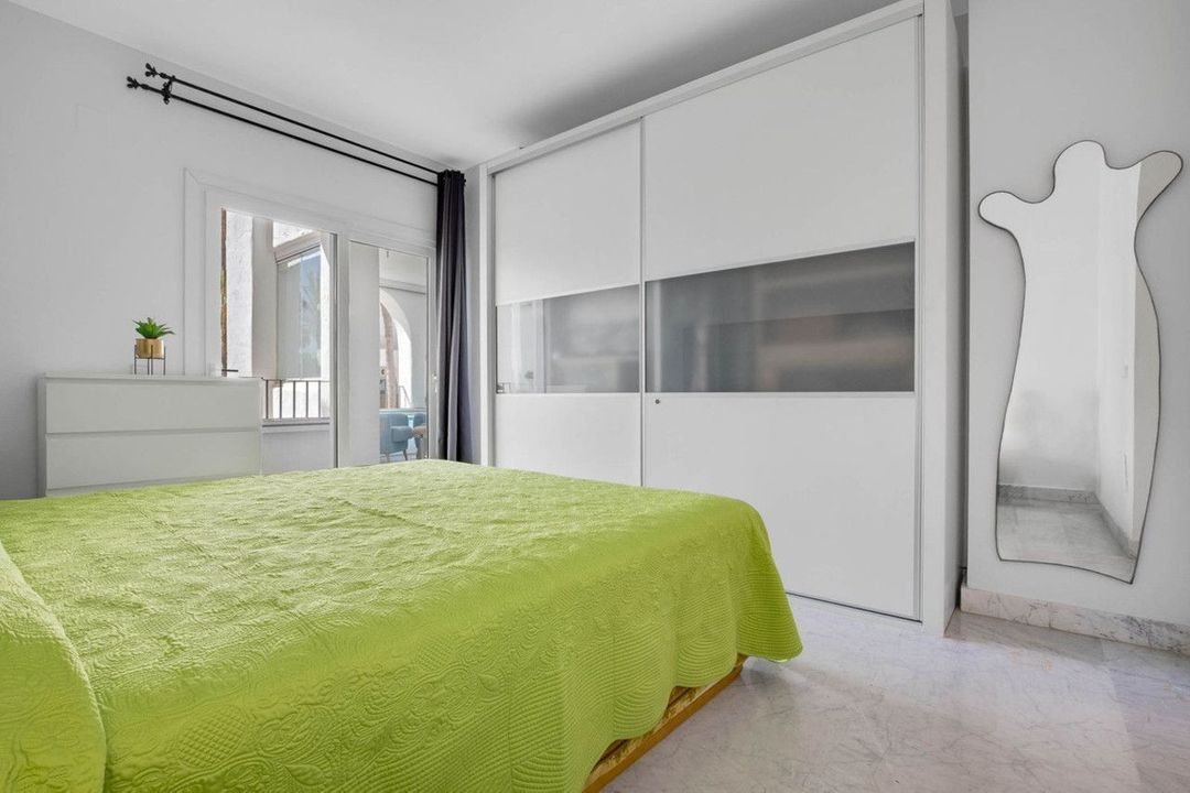 The master bedroom is generous in size and features an en-suite bathroom with double sink and walk-in shower, as well as three built-in wardrobes and access to the main terrace. The second bedroom, with white lacquered built-in wardrobes and a private balcony, is located next to a modern renovated bathroom with shower.