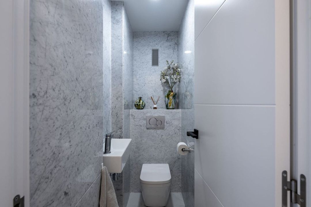 Dit ruime appartement op de eerste verdieping beschikt over drie slaapkamers, drie badkamers en een gastentoilet.
