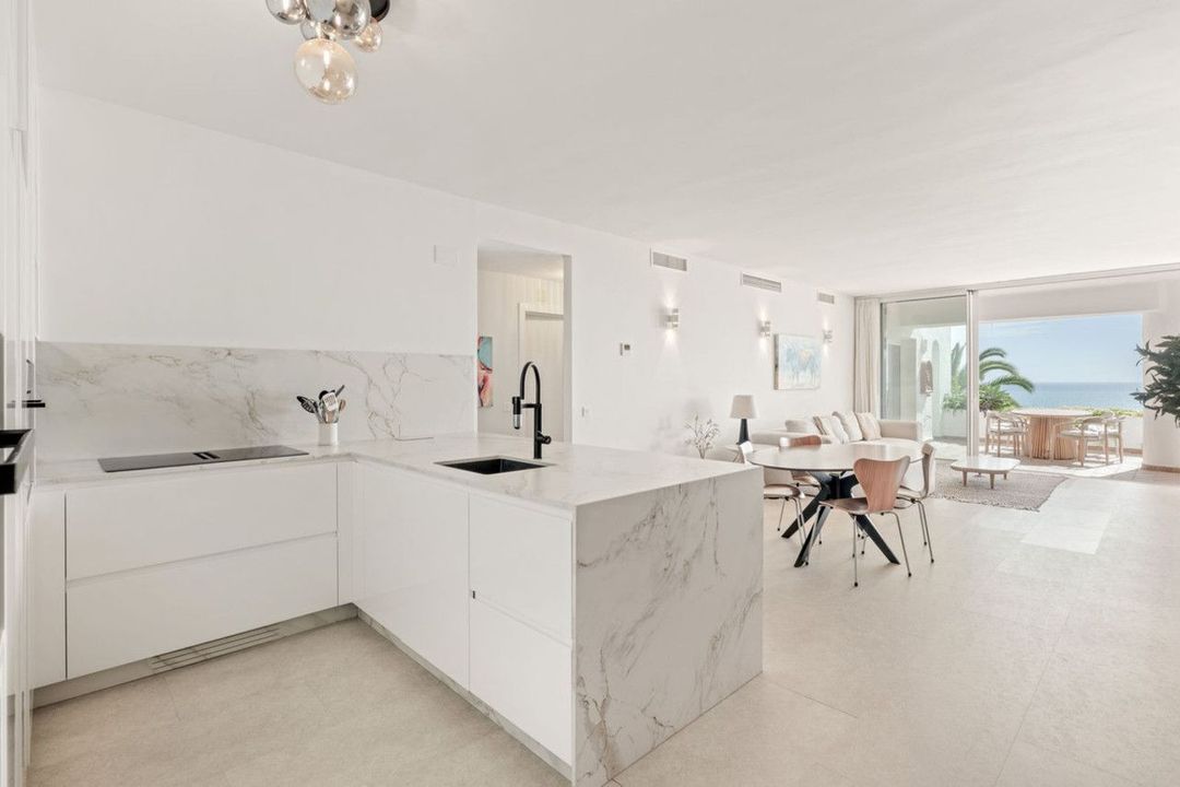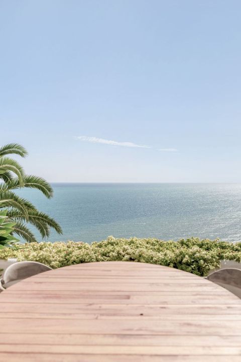De royale open keuken en woonkamer leiden naar een prachtig op het zuiden gelegen terras, met ongeëvenaard zeezicht, aangevuld met uitzicht op de tuinen en het zwembad.