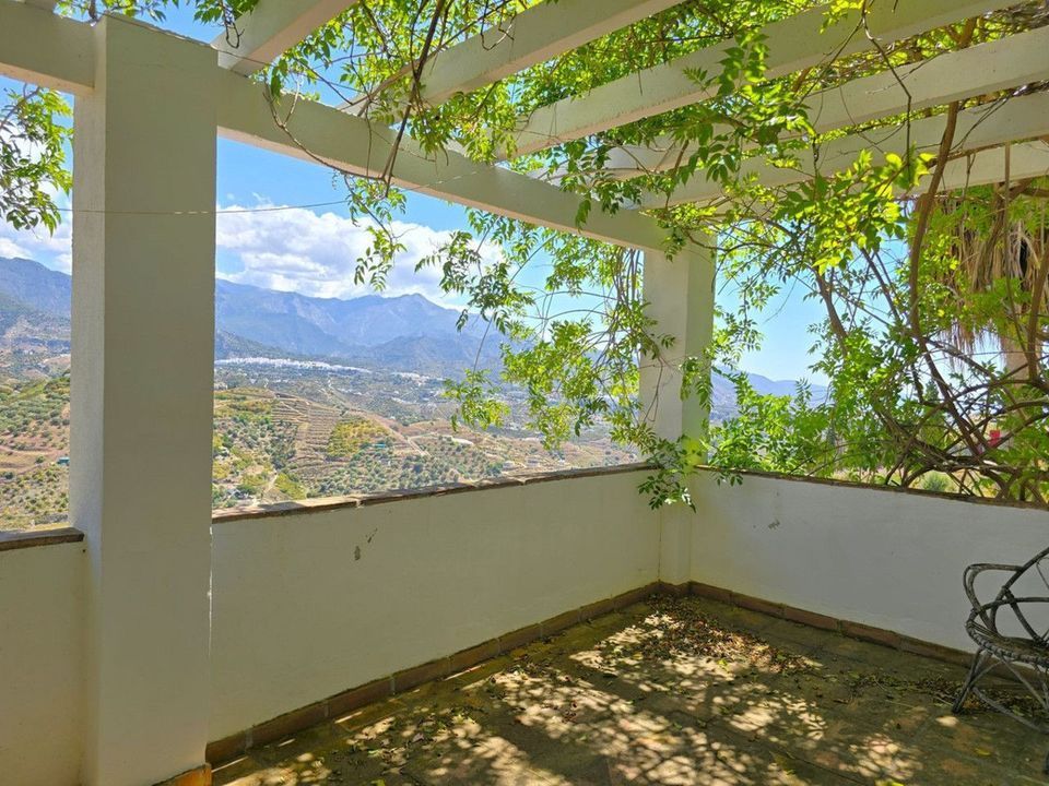 Laat u betoveren door deze karakteristieke Spaanse villa, waar traditionele architectuur en modern comfort samenkomen in een unieke woonbeleving. Het vrijstaande hoofdgebouw bestaat uit twee harmonieus verbonden vleugels, omgeven door een weelderige tuin met olijf- en vijgenbomen, en biedt een adembenemend panoramisch uitzicht over de witgekalkte dorpen Frigiliana en Nerja, met op de achtergrond de majestueuze bergen van Andalusië.