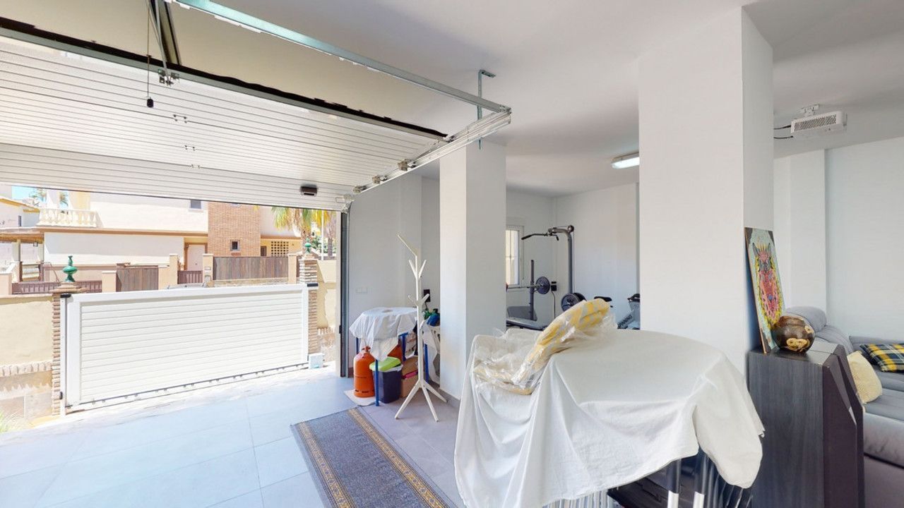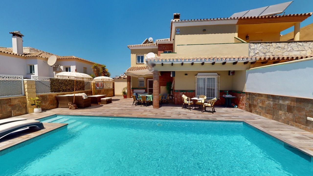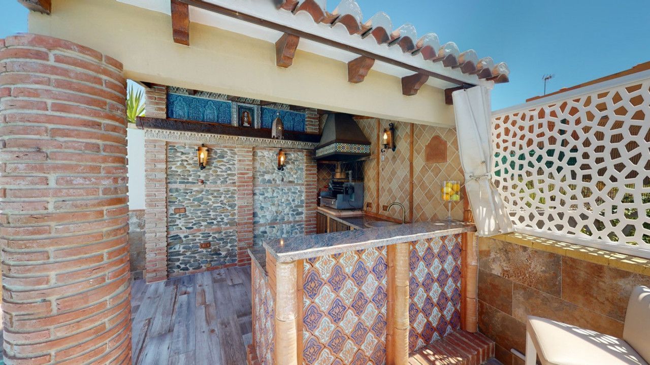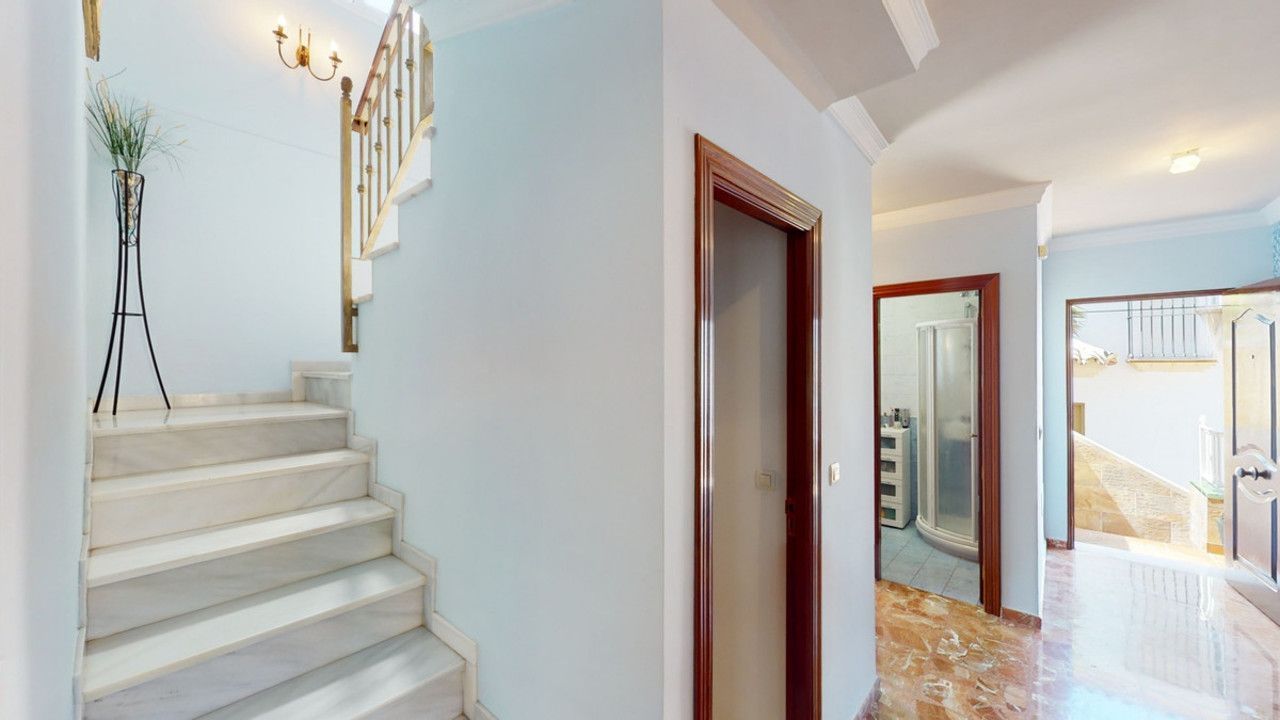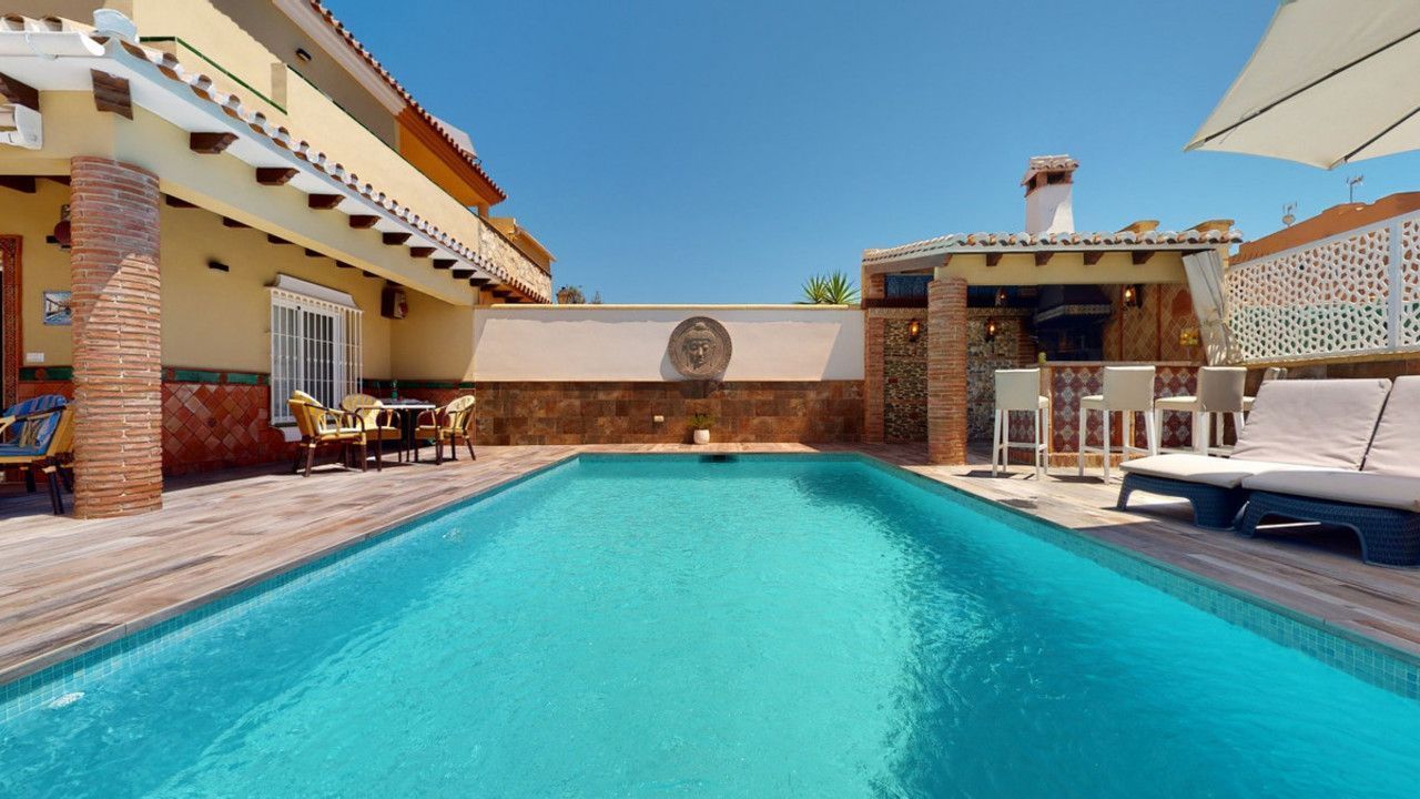 Mooie, gerenoveerde twee onder één kap woning in de rustige woonwijk Viña Malaga. Het huis met drie verdiepingen heeft twee ingangen. Het is verdeeld in 3 slaapkamers, 3 badkamers, een gastentoilet, 2 keukens, een woonkamer en een thuisbioscoop. De buitenruimte biedt verschillende ontspanningsruimtes, een zwembad en een buitenkeuken met barbecue. In het souterrain is er een dubbele garage, die nu in gebruik is als bioscoop, evenals een fitnessruimte, een keuken en een gastentoilet. Dit deel kan gebruikt worden voor het ontvangen van vrienden of als zelfstandig appartement met 2 slaapkamers. Vanuit de garage is er directe toegang tot de begane grond. De begane grond heeft een hal met garderobe, een badkamer met douche, een keuken met alle moderne apparatuur en een uitgang naar het balkon, een woon- en eetkamer met open haard. Vanuit de woonkamer is er tevens een uitgang naar de prachtige buitenruimte. Daar vindt u het grote terras met veel zit- en ligplekken rond het zwembad van 4 x 8 m, een buitendouche en stijlvolle decoraties. Er is ook een rustieke bar en een barbecue met water en elektriciteit. 's Avonds is alles romantisch verlicht en kun je heerlijk eten met familie en vrienden. Op de eerste verdieping bevinden zich de drie slaapkamers, waarvan één met dressing en en-suite badkamer. Elke slaapkamer heeft een eigen balkon met uitzicht op zee. De woning is gebouwd in 2002 en recentelijk gerenoveerd. Mis de kans niet om deze prachtige twee onder één kap woning te bezoeken, die op slechts 5 minuten van het strand, de snelweg en de golfbaan ligt. We zijn verheugd dit droomhuis binnenkort aan u te kunnen presenteren, persoonlijk of via virtuele bezichtiging. Omdat deze wereld uniek is - net als onze Axarquía. In Andalusië. Aan de Costa del Sol. Hier, aan de zonnige kant van het leven...