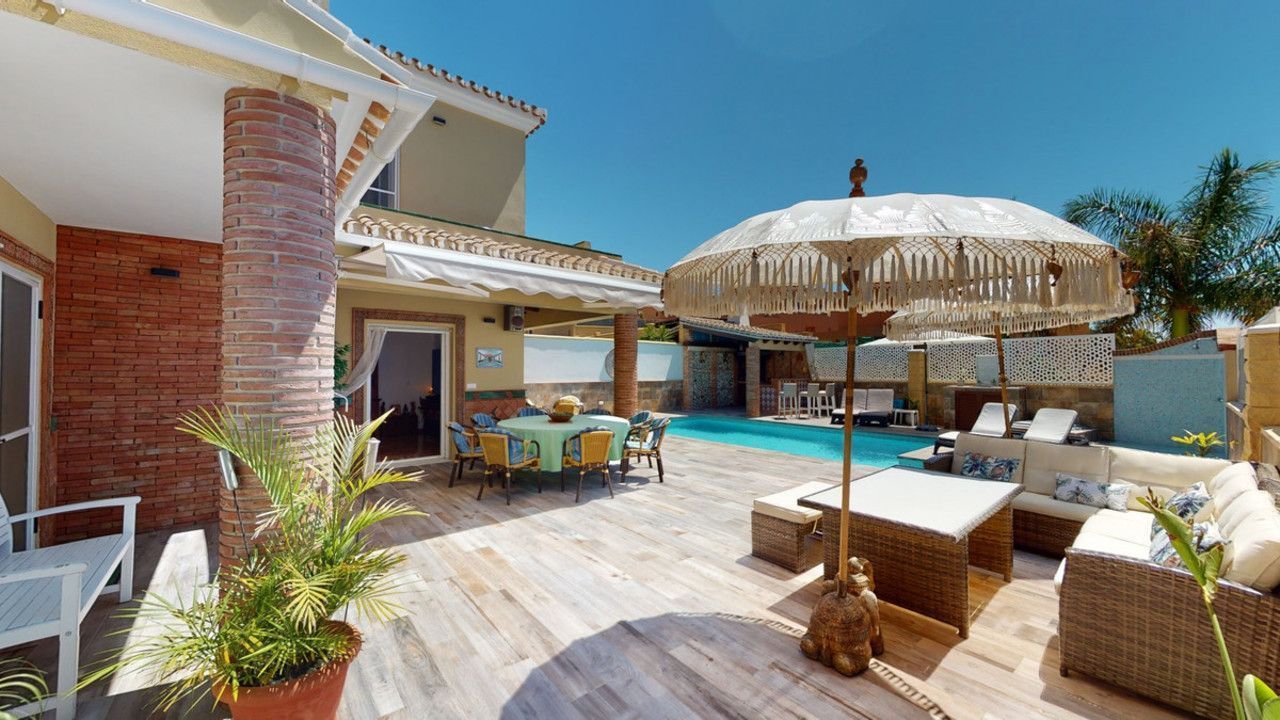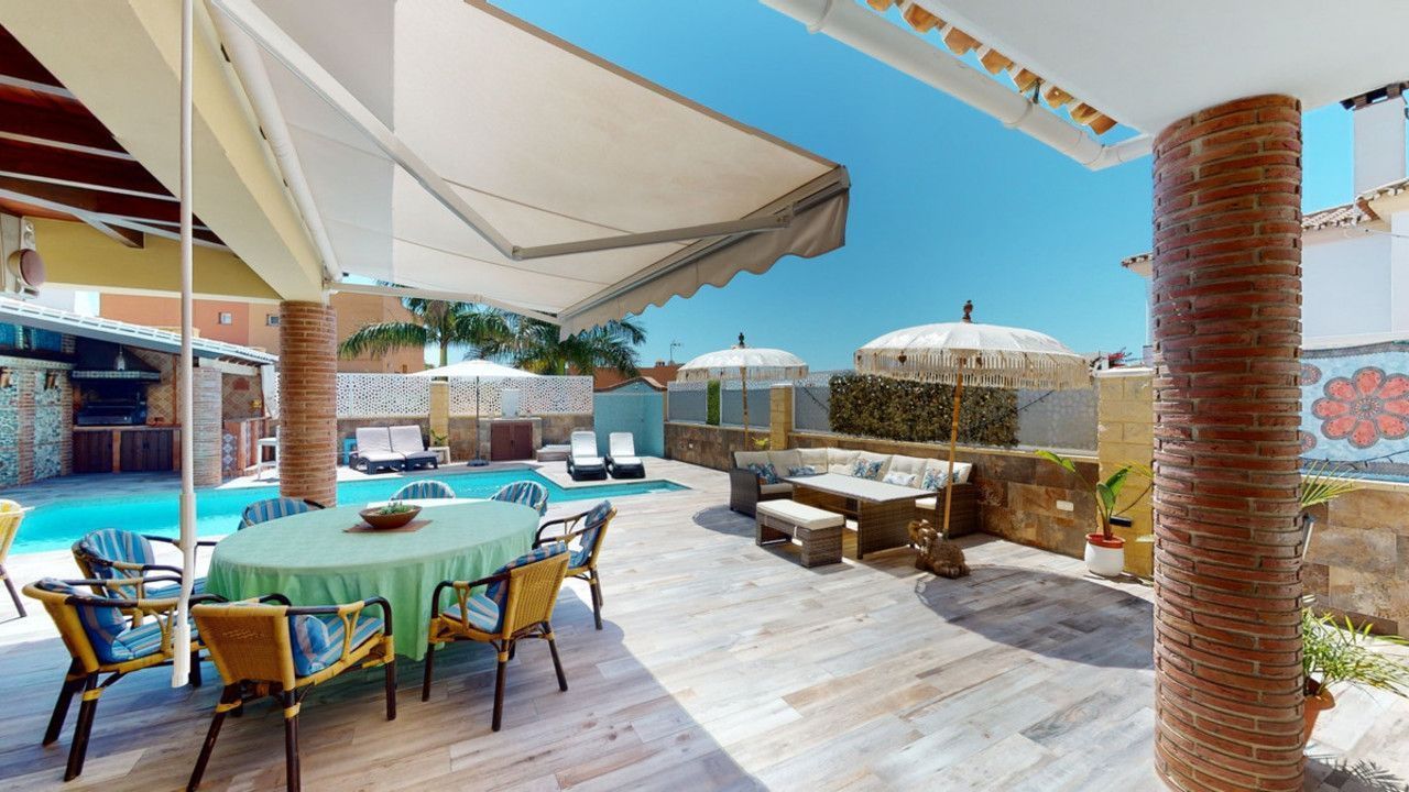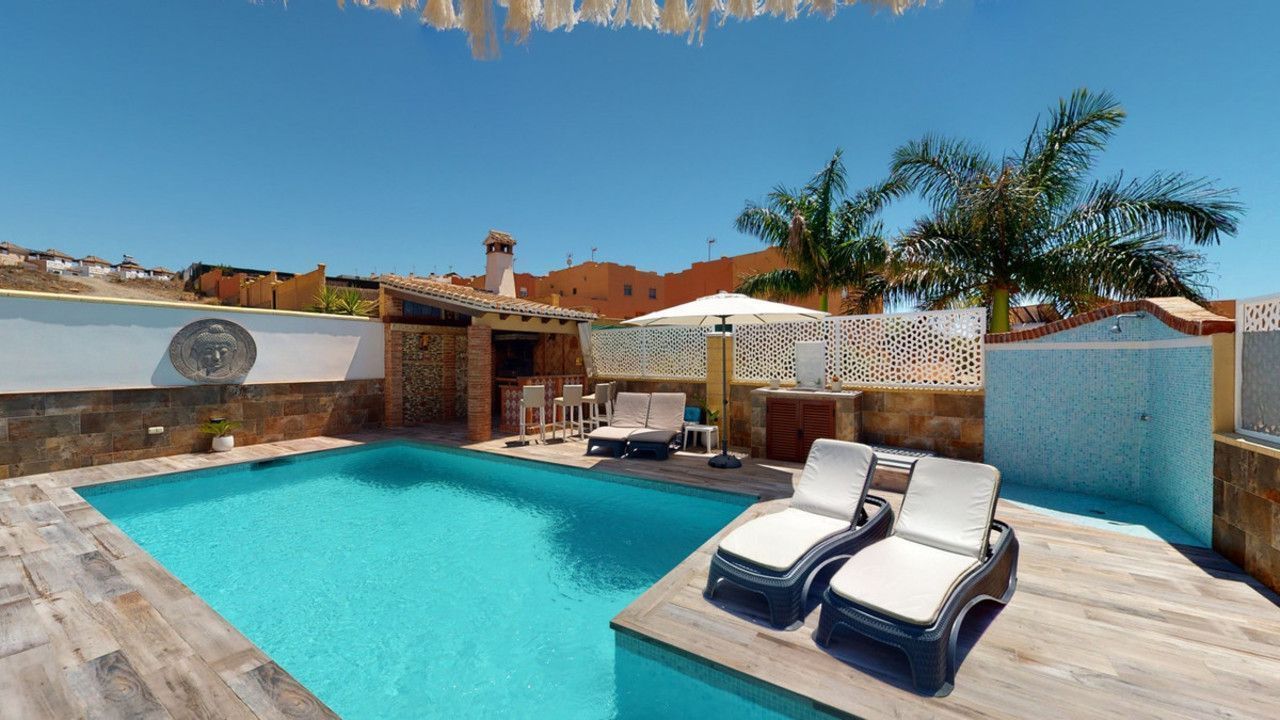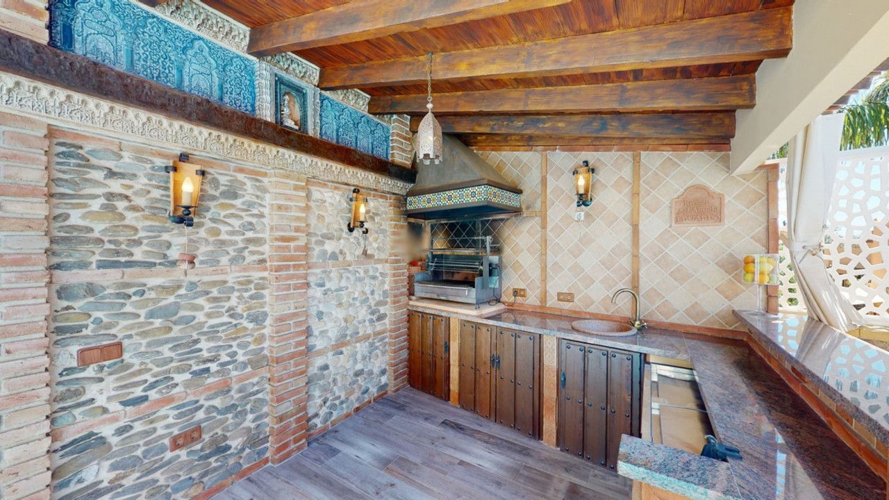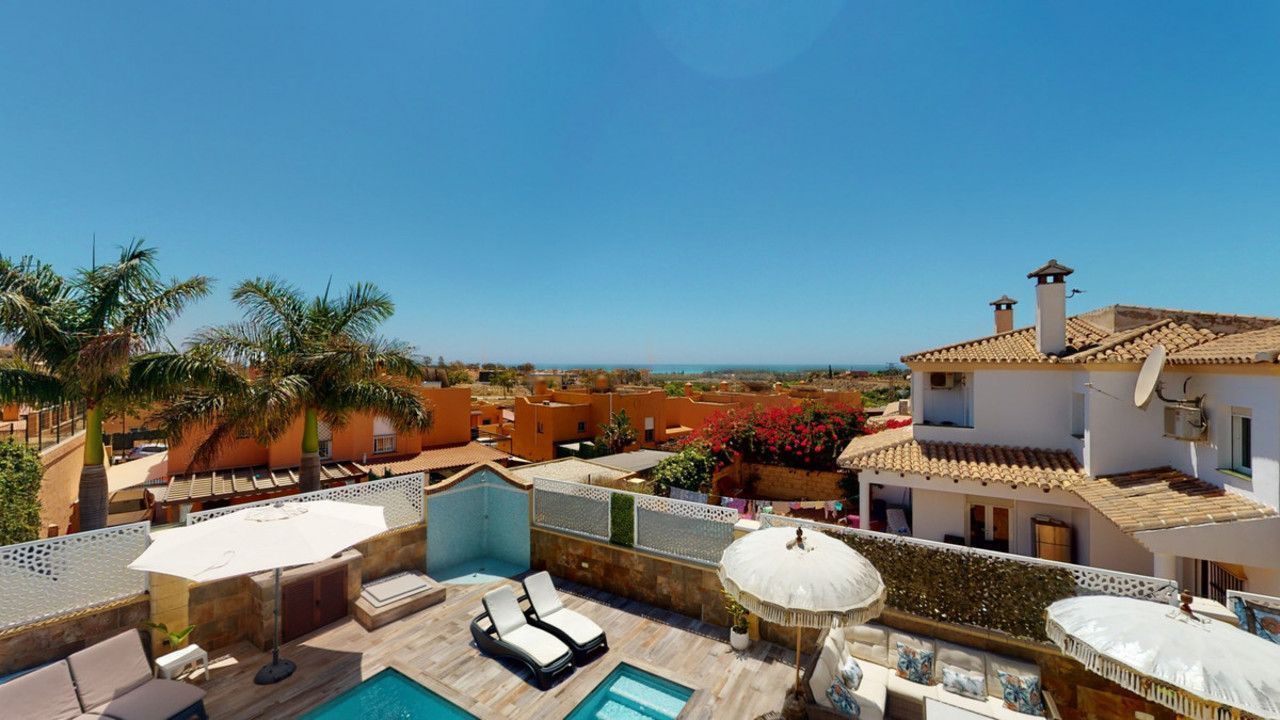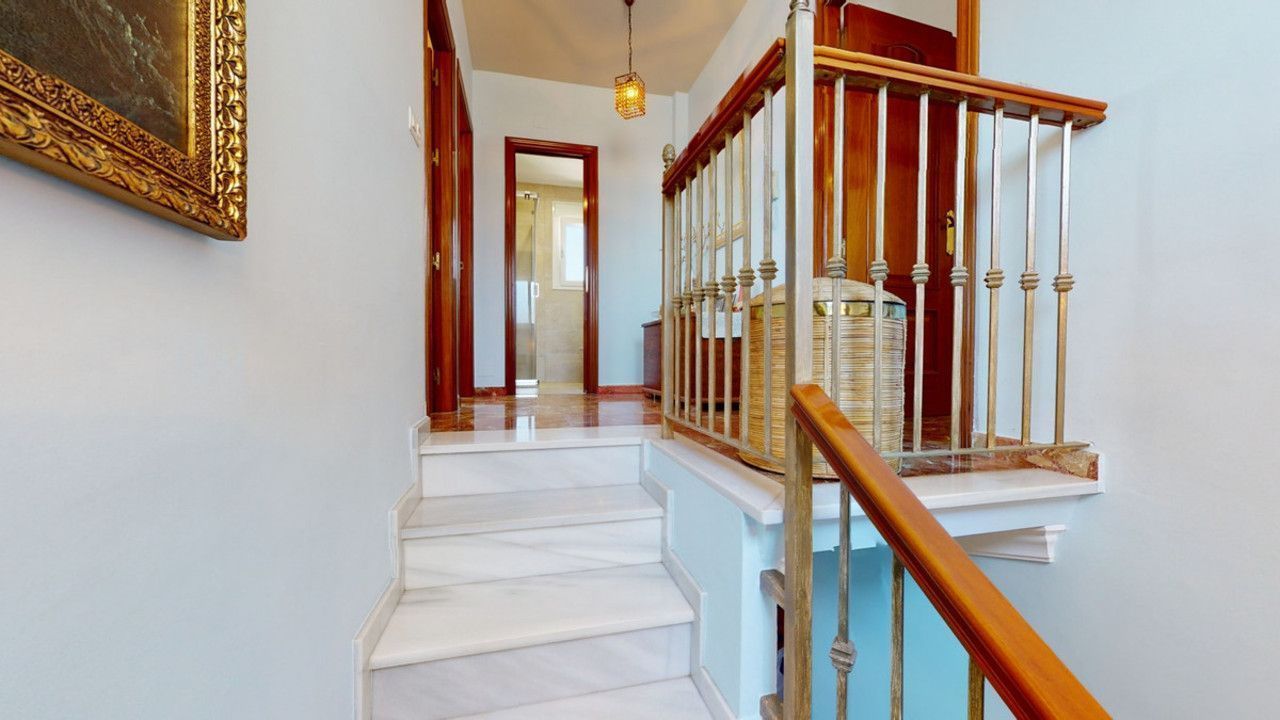 Mooie, gerenoveerde twee onder één kap woning in de rustige woonwijk Viña Malaga. Het huis met drie verdiepingen heeft twee ingangen. Het is verdeeld in 3 slaapkamers, 3 badkamers, een gastentoilet, 2 keukens, een woonkamer en een thuisbioscoop. De buitenruimte biedt verschillende ontspanningsruimtes, een zwembad en een buitenkeuken met barbecue. In het souterrain is er een dubbele garage, die nu in gebruik is als bioscoop, evenals een fitnessruimte, een keuken en een gastentoilet. Dit deel kan gebruikt worden voor het ontvangen van vrienden of als zelfstandig appartement met 2 slaapkamers. Vanuit de garage is er directe toegang tot de begane grond. De begane grond heeft een hal met garderobe, een badkamer met douche, een keuken met alle moderne apparatuur en een uitgang naar het balkon, een woon- en eetkamer met open haard. Vanuit de woonkamer is er tevens een uitgang naar de prachtige buitenruimte. Daar vindt u het grote terras met veel zit- en ligplekken rond het zwembad van 4 x 8 m, een buitendouche en stijlvolle decoraties. Er is ook een rustieke bar en een barbecue met water en elektriciteit. 's Avonds is alles romantisch verlicht en kun je heerlijk eten met familie en vrienden. Op de eerste verdieping bevinden zich de drie slaapkamers, waarvan één met dressing en en-suite badkamer. Elke slaapkamer heeft een eigen balkon met uitzicht op zee. De woning is gebouwd in 2002 en recentelijk gerenoveerd. Mis de kans niet om deze prachtige twee onder één kap woning te bezoeken, die op slechts 5 minuten van het strand, de snelweg en de golfbaan ligt. We zijn verheugd dit droomhuis binnenkort aan u te kunnen presenteren, persoonlijk of via virtuele bezichtiging. Omdat deze wereld uniek is - net als onze Axarquía. In Andalusië. Aan de Costa del Sol. Hier, aan de zonnige kant van het leven...