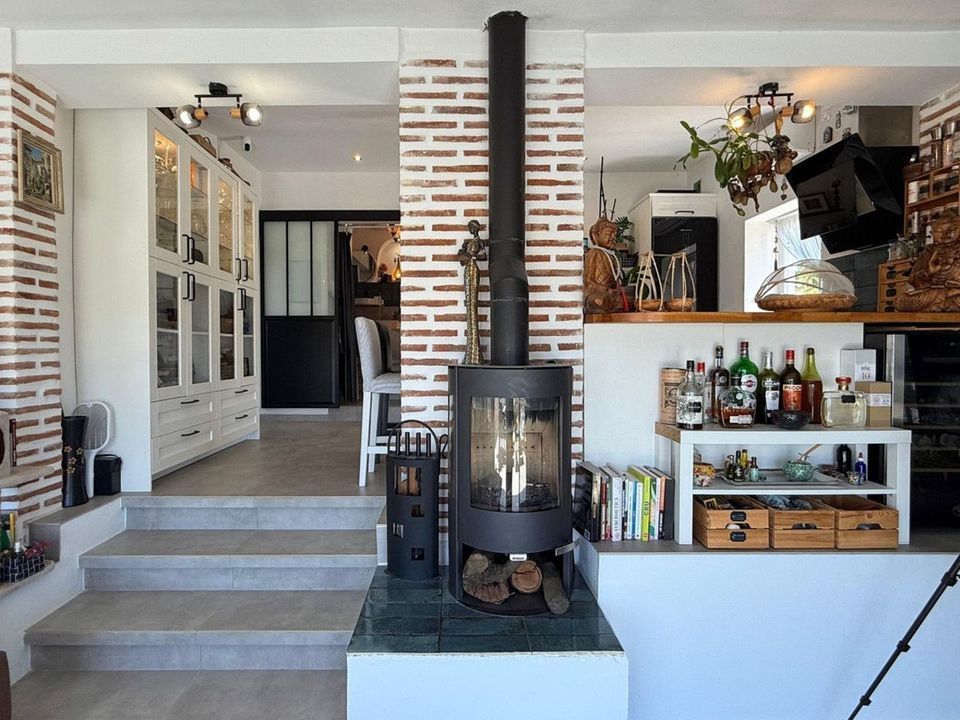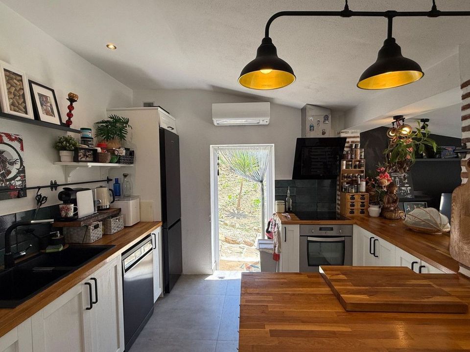 "Chiringuito" style space with a complete kitchen, barbecue, griddle, and outdoor dining area.